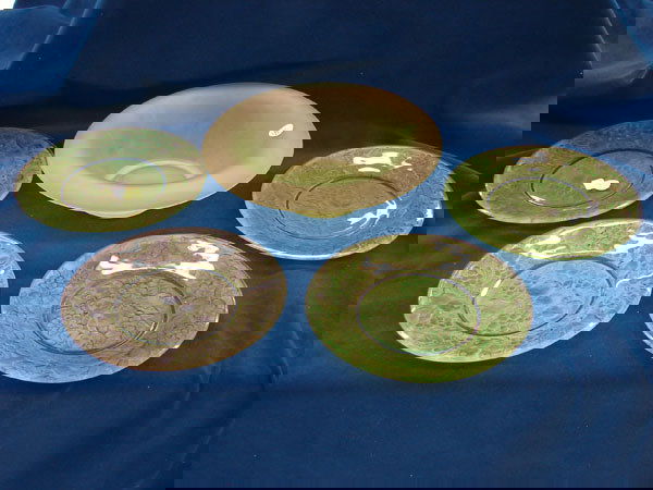 5 items, 4 signed Daum Nancy plates 8"D, Green sa
