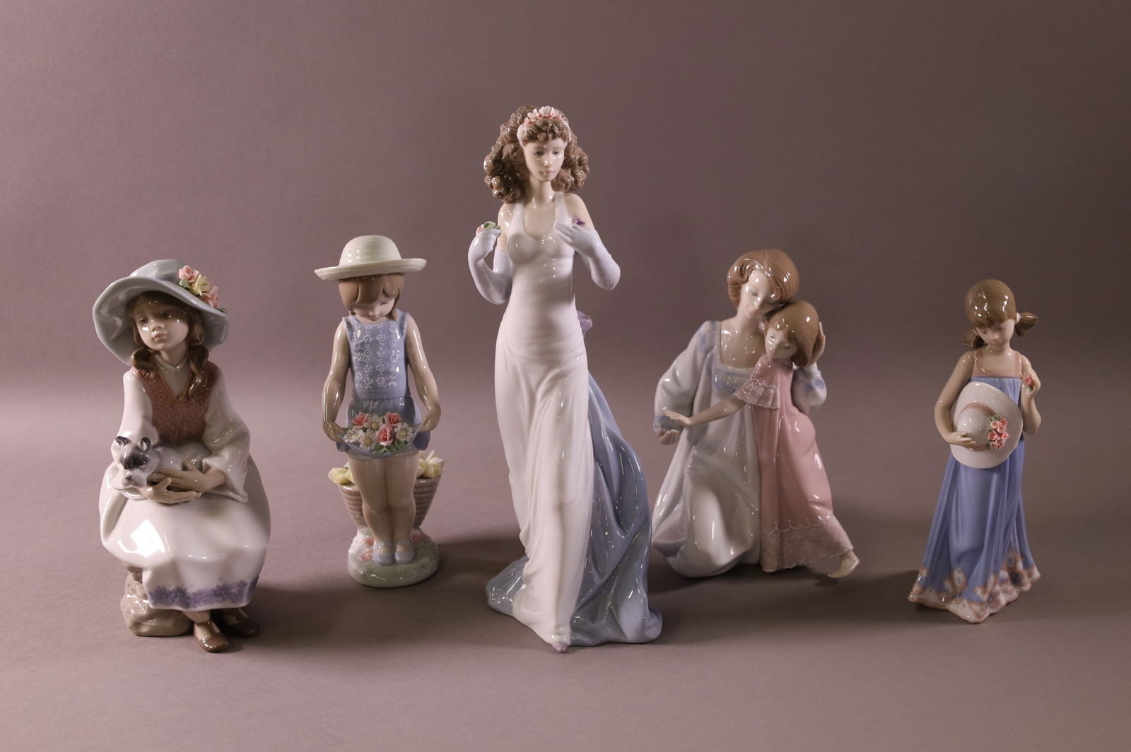 SoldLot of 5 Lladro FigurinesLot of Five Lladro figurines, 1) Sleeping angel with flower crown. Condition: Excellent. H 7" W 7", 2) Young girl with bouquet. Condition: Excellent. H 6" W 4", 3) Pair of dancing ladies. Condition: ESee Sold Price
