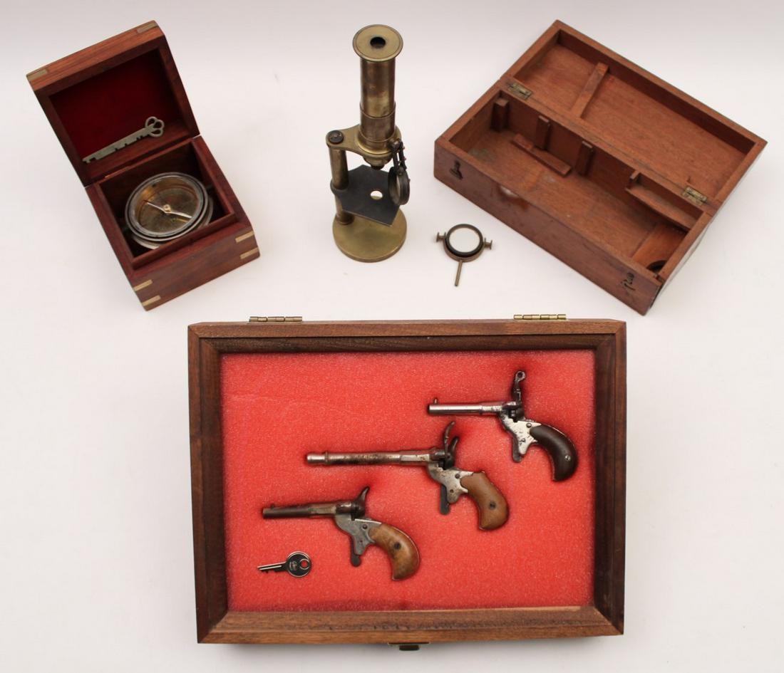 5 PC. LOT; COMPASS, MICROSCOPE & 3 CAP PISTOLS IN CASE