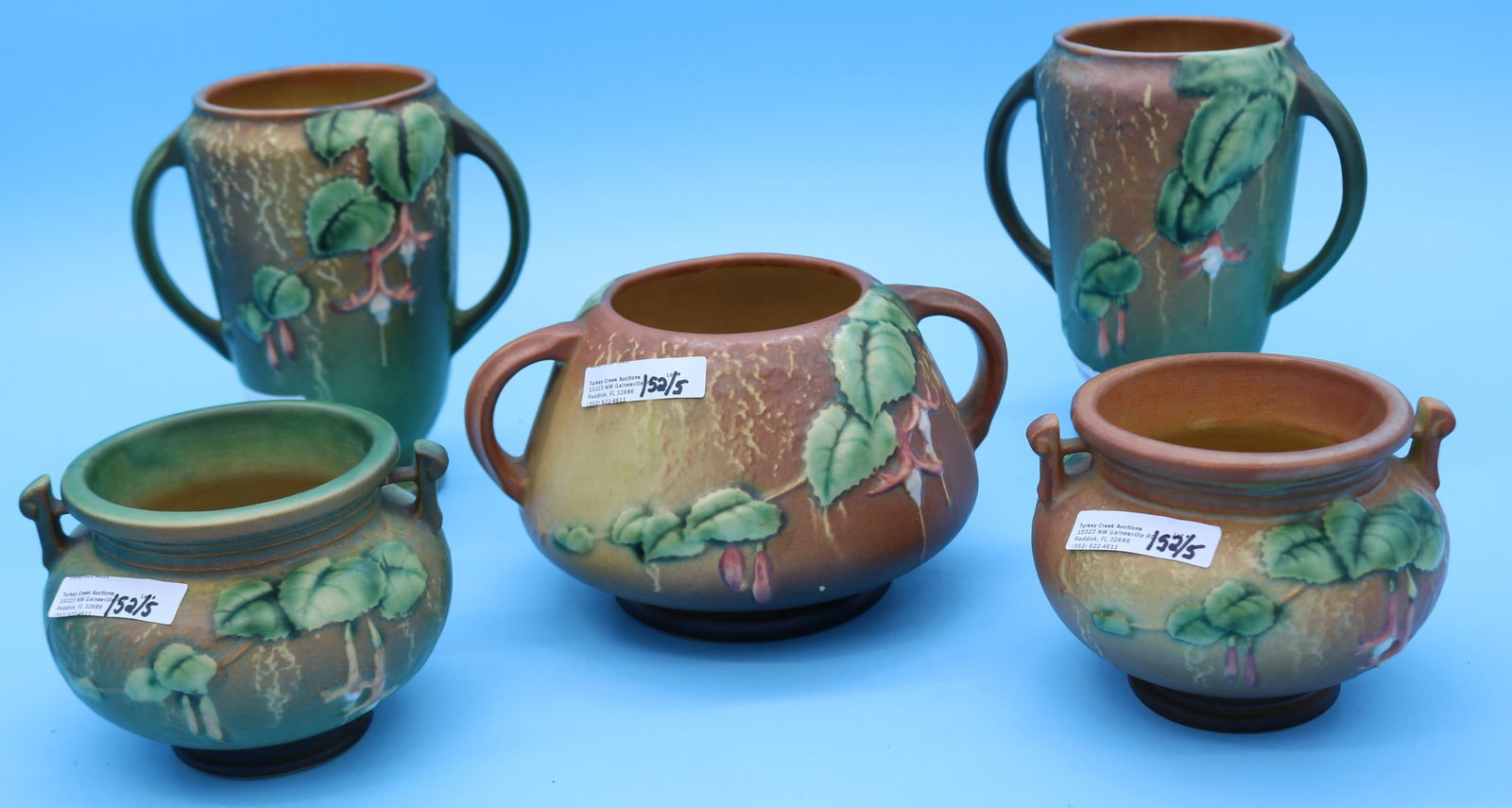 5 PCS. ROSEVILLE FUCHSIA PATTERN, 2 HANDLED VASES