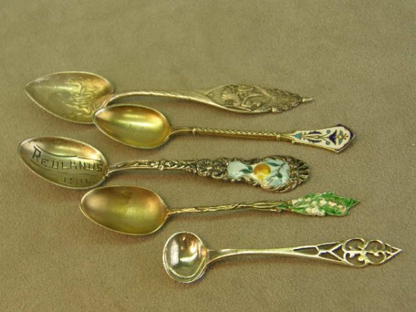 5 SMALL STERLING SPOONS -2 ENAMELLED