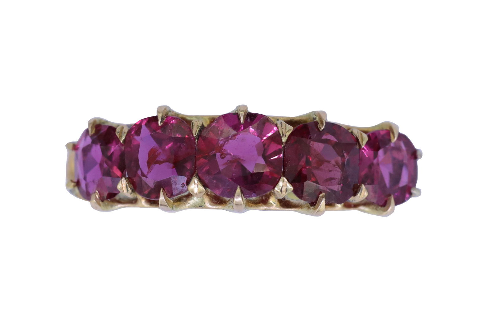 SoldANTIQUE 5-STONE RUBY RINGANTIQUE 5-STONE RUBY RING, set with 5 rubies totalling approx. 2.23 ct. Size K 1/2. 2.7 grams. Accompanied by GCS London report No. 80262-78 stating that the rubies are natural, Burma origin, with noSee Sold Price