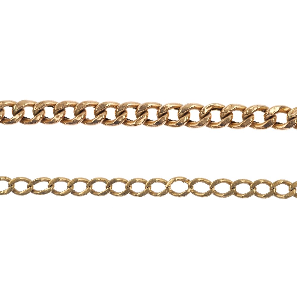 SoldTwo curb-link necklaces and two bracelets. One necklaceTwo curb-link necklaces and two bracelets. One necklace with a figure-of-eight clasp, one with a spring-release clasp, the first bracelet of thick curb-link design, the second of belcher-link design wSee Sold Price