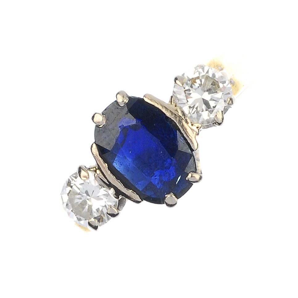 (54052) A sapphire and diamond three-stone ring.