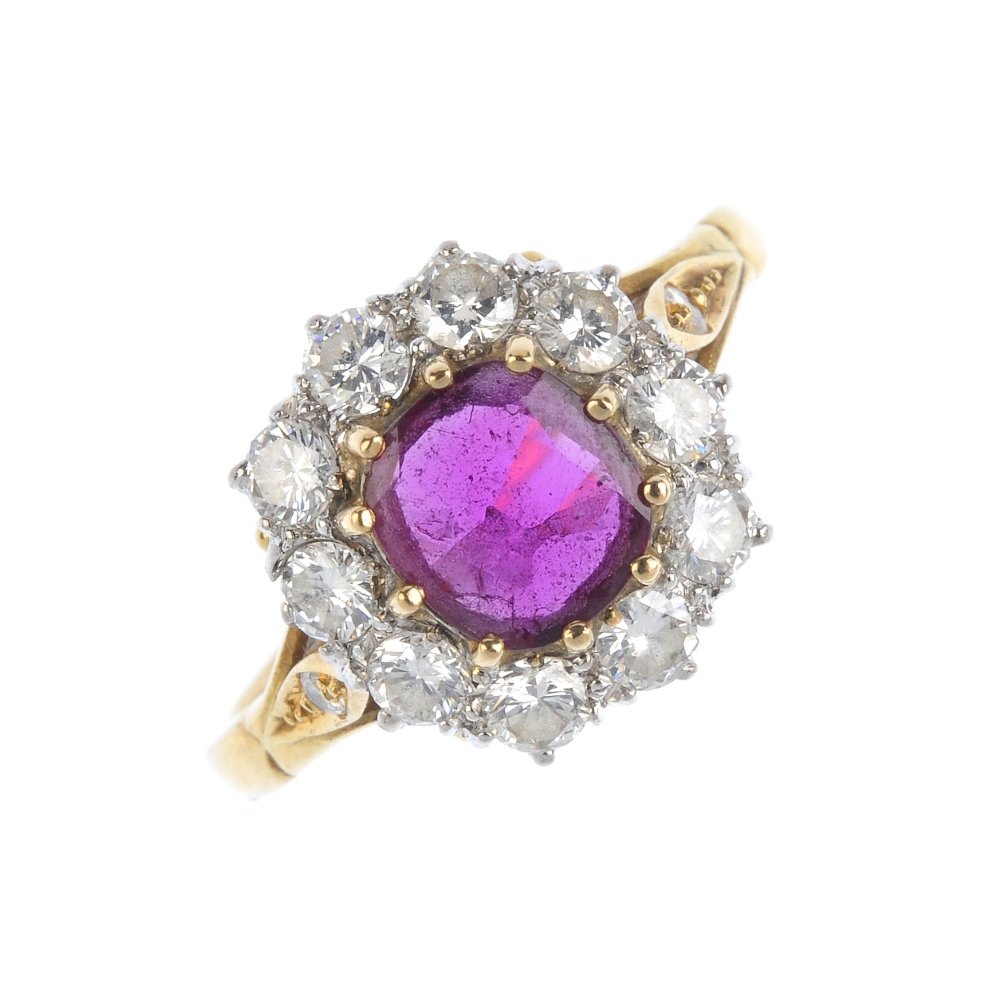 (545948-1-A) A ruby and diamond cluster ring. The