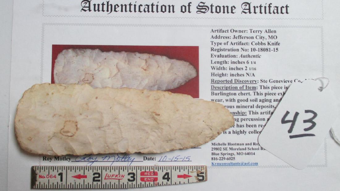 5 3/4" Ramey Knife, St Louis Co., MissouriMar 01, 2026Dovetail with Thomas Matthews COA from Meade County, Kentucky Indian Artifact Arrowhead3 days LeftScottsbluff with Thomas Matthews COA from Oklahoma Indian Artifact Arrowhead3 days LeftDovetail with Thomas Matthews COA from Tennessee Indian Artifact Arrowhead3 days Left6 1/2" Paleo Crescent Knife, Pike Co., MissouriMar 01, 2026Paleo Knives from Missouri 4 1/4"Feb 19, 2026Lost Lake with Thomas Matthews COA from Bath County, Kentucky Indian Artifact Arrowhead3 days LeftClovis with Thomas Matthews COA from Ohio Indian Artifact Arrowhead3 days LeftClovis with Bannerstone Tom COA from Thomas County, Georgia Indian Artifact Arrowhead3 days LeftDovetail with Thomas Matthews COA from Ohio Indian Artifact Arrowhead3 days LeftEden with Thomas Matthews COA from Oklahoma Indian Artifact Arrowhead3 days Left4 5/8" x 1 5/8" Cobbs Triangle, Undetermined Chert, Missouri, COA Jerry DickeyMar 01, 2026Clovis with Thomas Matthews COA from North Carolina Indian Artifact Arrowhead3 days LeftFolsom with Thomas Matthews COA from Texas Indian Artifact Arrowhead3 days Left5 3/8" X 2 1/4" Stanfield, Motley COA, Found in Pike Co. IL., Ex Mark McDaniels3 days LeftClovis with Thomas Matthews COA from Kentucky Indian Artifact Arrowhead3 days Left