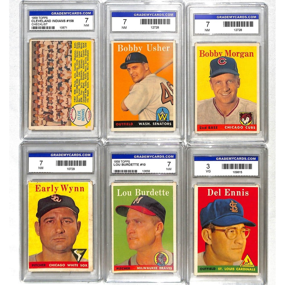 SoldFive 1950's Graded Topps Baseball Cards PSA 7,6,5Five 1950's graded Topps baseball cards. All graded PSA 5, 6 or 7. Includes Willie Mays, Pee Wee Reese, Nellie Fox and more. 1958 Topps Mickey Mantle/Hank Aaron World Series Batting Foes #418 PSA 6. ESee Sold Price