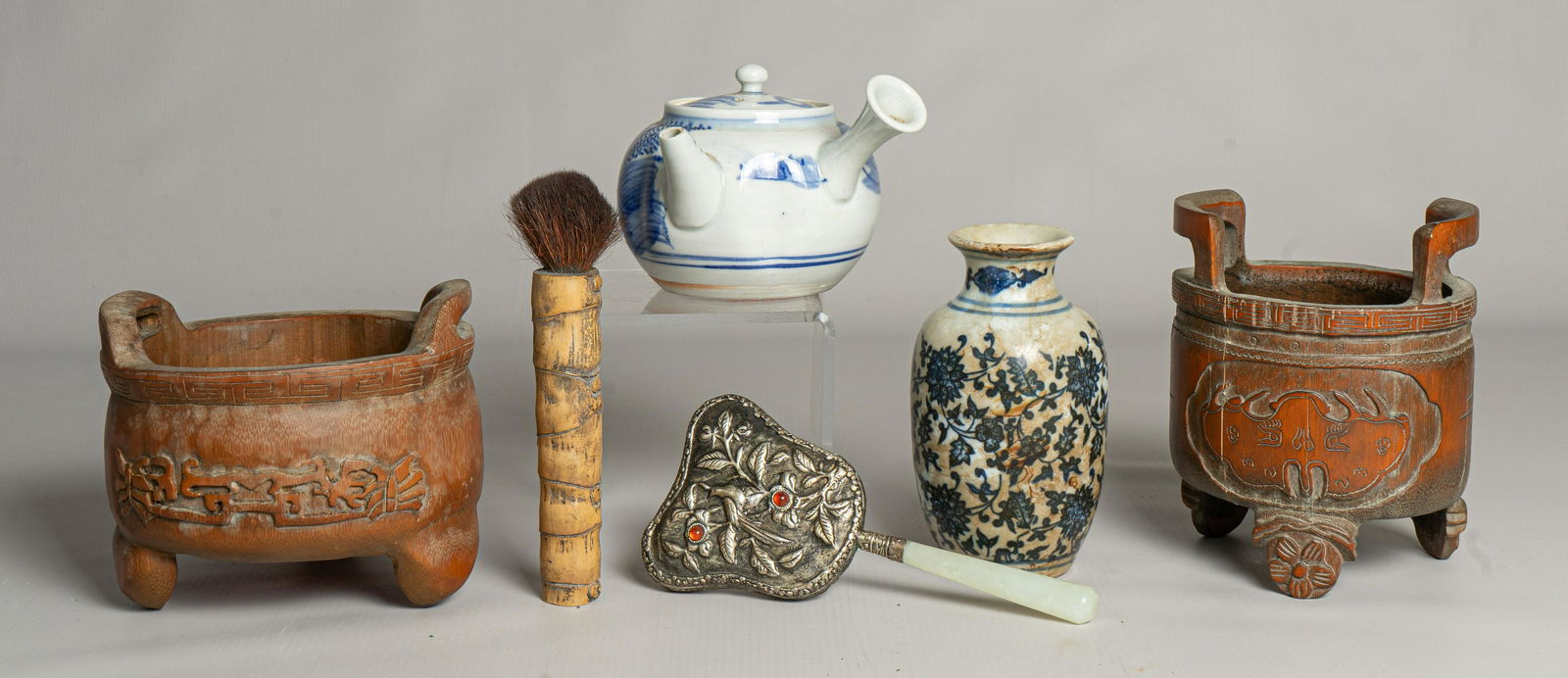 SoldTwelve Asian Small Ceramic, Wooden and Glass ItemsTwelve Asian Small Ceramic, Wooden and Glass Items, Three pieces 19thC table items, a 3 1/2" diameter covered box, 6" tall tea caddy, 3 1/2" cubed teapot, four saki cups, four snuff bottles and a carvSee Sold Price
