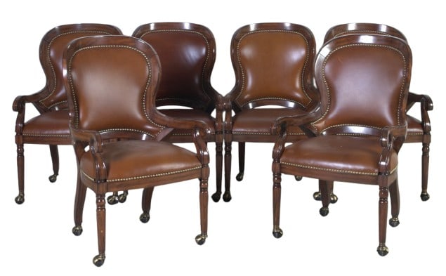 A RARE LOT OF SIXTEEN BALLOON BACK PAINTED WOOD AND LEATHER DINING CHAIRS ATTRIBUTED TO JANSEN CMar 24, 2026Elegant Pair of Councill Craftsmen Mahogany Leather ArmchairsMar 22, 2026Pair of Councill Craftsmen Mahogany Leather Open Armchairs1 day LeftCouncill Craftsmen Brown Leather Open Armchairs with Brass FeetMar 18, 2026SIX LOUIS XVI STYLE LEATHER & MAHOGANY SIDE CHAIRSMar 26, 2026Eight Green Leather Armchairs in French Inspired Design Set of 83 days Left8 Mahogany Federal Style Shield Back Dining Chairs with Fine Carved Details Set of 84 days LeftSix Louis XVI Style Embossed Leather Dining Chairs, mid/late 20th c., H.- 39 in., W.- 18 in., D.- 17Mar 26, 2026Set of 6 mid century dining room chairs in mahogany finish14 hrs LeftA set of five George IV-style mahogany and leather dining chairs, of recent manufacture,Mar 17, 2026Set of 10 Ej Victor Georgian Mahogany Dining Chairs with Leather Seats9 hrs LeftSix Turned Wood and Leather Upholstered Armchairs5 days LeftSet of Eight Leather Louis XVI Inspired Dining Chairs with Wide Seats7 days LeftEight Mahogany 1950s Dining Chairs in 18th Century English Style Set of 83 days LeftSet of 8 Stickley Chippendale Mahogany Dining Chairs Model 8297-1512 hrs LeftEIGHT FRENCH MAHOGANY AND LEATHER DINING CHAIRS C 1940 IN THE MANNER OF JEAN-MICHEL FRANK. A NINTHMar 25, 2026