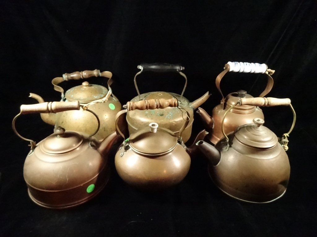6 COPPER TEAPOTS, LARGEST APPROX 9"H, SKU283.02