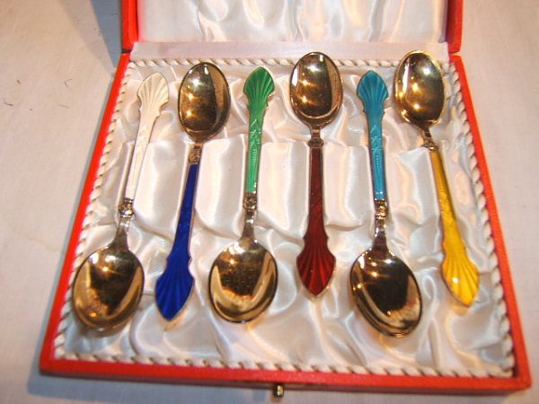 SoldSET OF 6 DANISH STERLING SILVER DEMITASSE SPOONS. GOLDSET OF 6 DANISH STERLING SILVER DEMITASSE SPOONS. GOLD WASHED AND ENAMEL DECORATED. EACH SPOON MEASURING 3 3/4 INCHES. COMES IN THE ORIGINAL FITTED BOX.See Sold Price