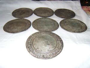 SoldSET 6 VINTAGE JAPANESE 970 SILVER COASTERSEach being 3" in diameter, with etched image of MT Fuji and other Japanese images, 6 in total almost pure silver being 970, total weight of the 6 coasters 172 gramsSee Sold Price