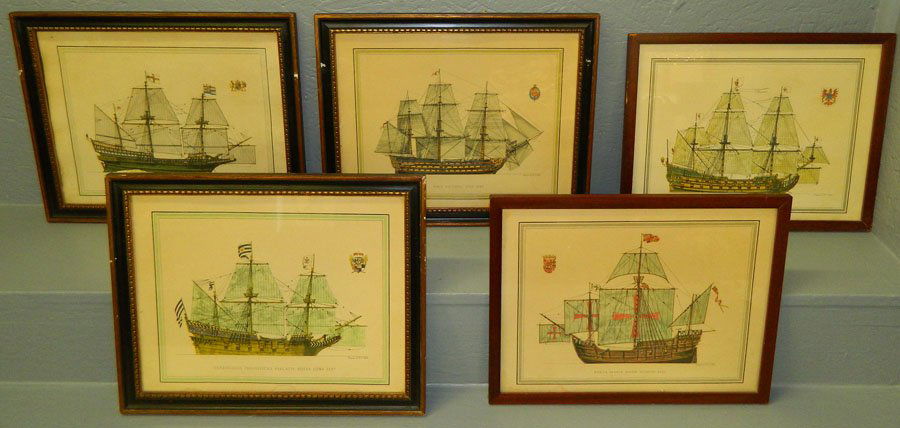 6 framed nautical colored lithographs.