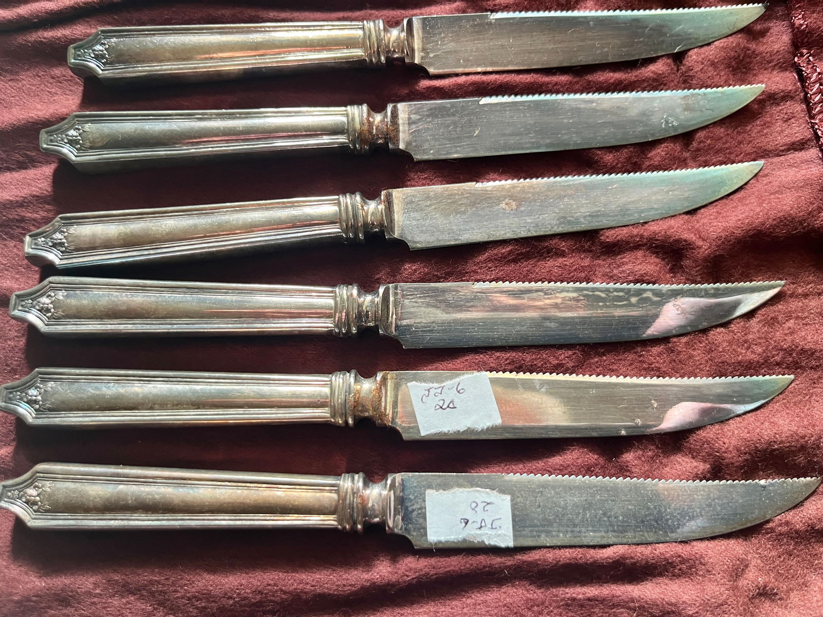 A Large Lot of Silverplated Knives18 hrs LeftS. S. United States Silverware (5)Feb 21, 20267 Vintage Eternally Yours Stainless Steel KnivesMar 04, 20267 Piece Sterling Silver Stieff Flatware ItemsFeb 28, 2026Towle Legato Sterling Silver Steak Knife Set 8pc Not Serrated 8"Feb 24, 2026Josef Reiner 12pc .800 Silver Knife Set with Silverplate Blades 8 1/4"Feb 24, 20265 Vintage King Cedric Stainless Steel KnivesJul 17, 20256 Turn-of-Century Pennyweight Silver Plate Knives1 day LeftGorham Decor Sterling Silver Steak Knife Set 8pc Not Serrated 8"2 days LeftGORHAM SILVERWARE 8 PIECE KNIFE SET STERLING AND STAINLESS STEELJun 29, 2025Towle Sixteen-Ninety Sterling Silver Steak Knife Set 4pc Texas Sized6 hrs LeftTowle Fontana Sterling Silver Steak Knife Set 12 pcs 8.5" Custom MadeFeb 27, 2026International Sterling Old Charleston 6pc Trout Knife Set Custom MadeFeb 22, 2026International Sterling Silver Edgewood Trout Knife Set 6pc Custom Made6 days LeftTowle Old Master Sterling Silver 4-Piece Fruit Knife Set 7 InchMar 01, 2026Windsor Rose by Watson Sterling Silver Steak Knife Set 4pc Custom 8.5"5 days Left