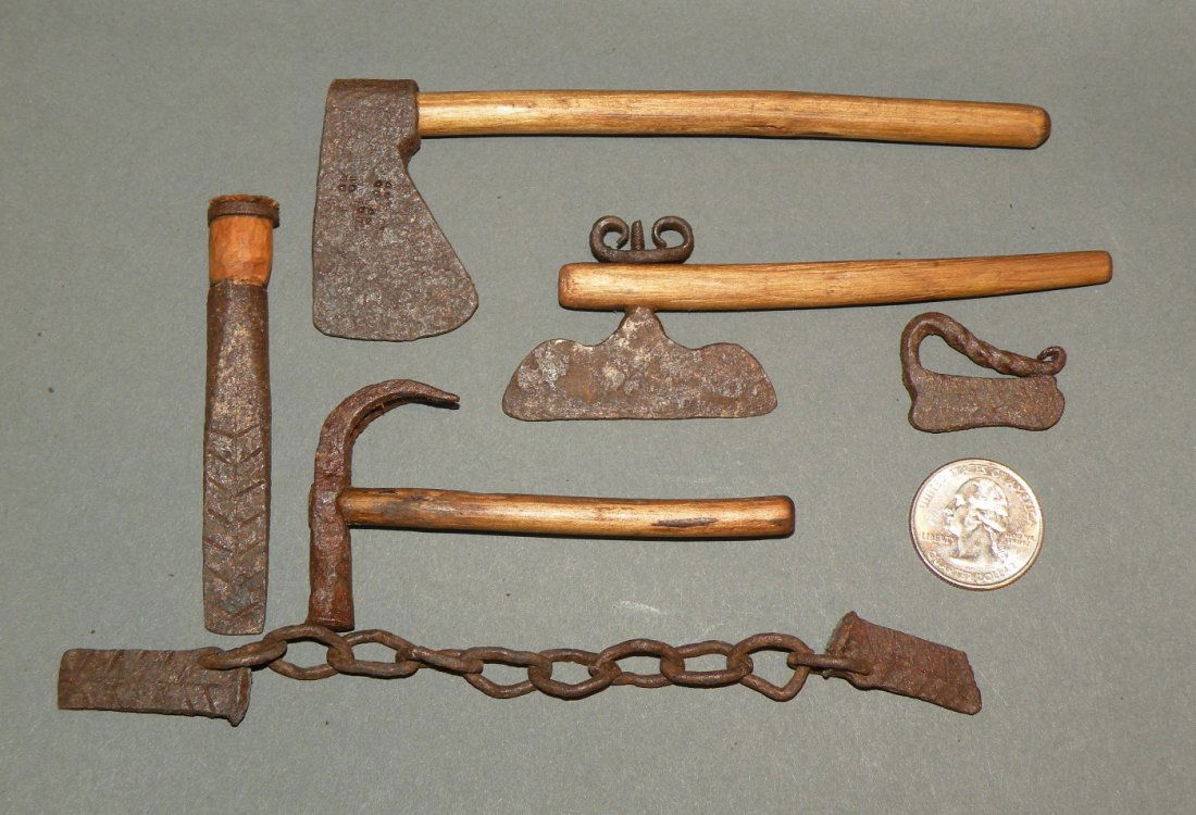 6 hand wrought miniature tools