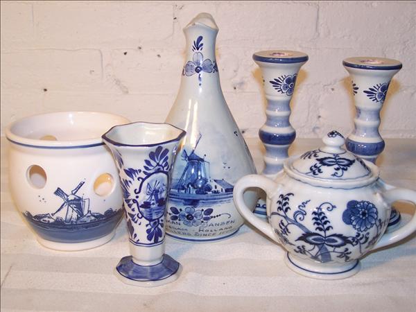 6 pc Delft -2 candle sticks/1 bud vase/pitcher/bow