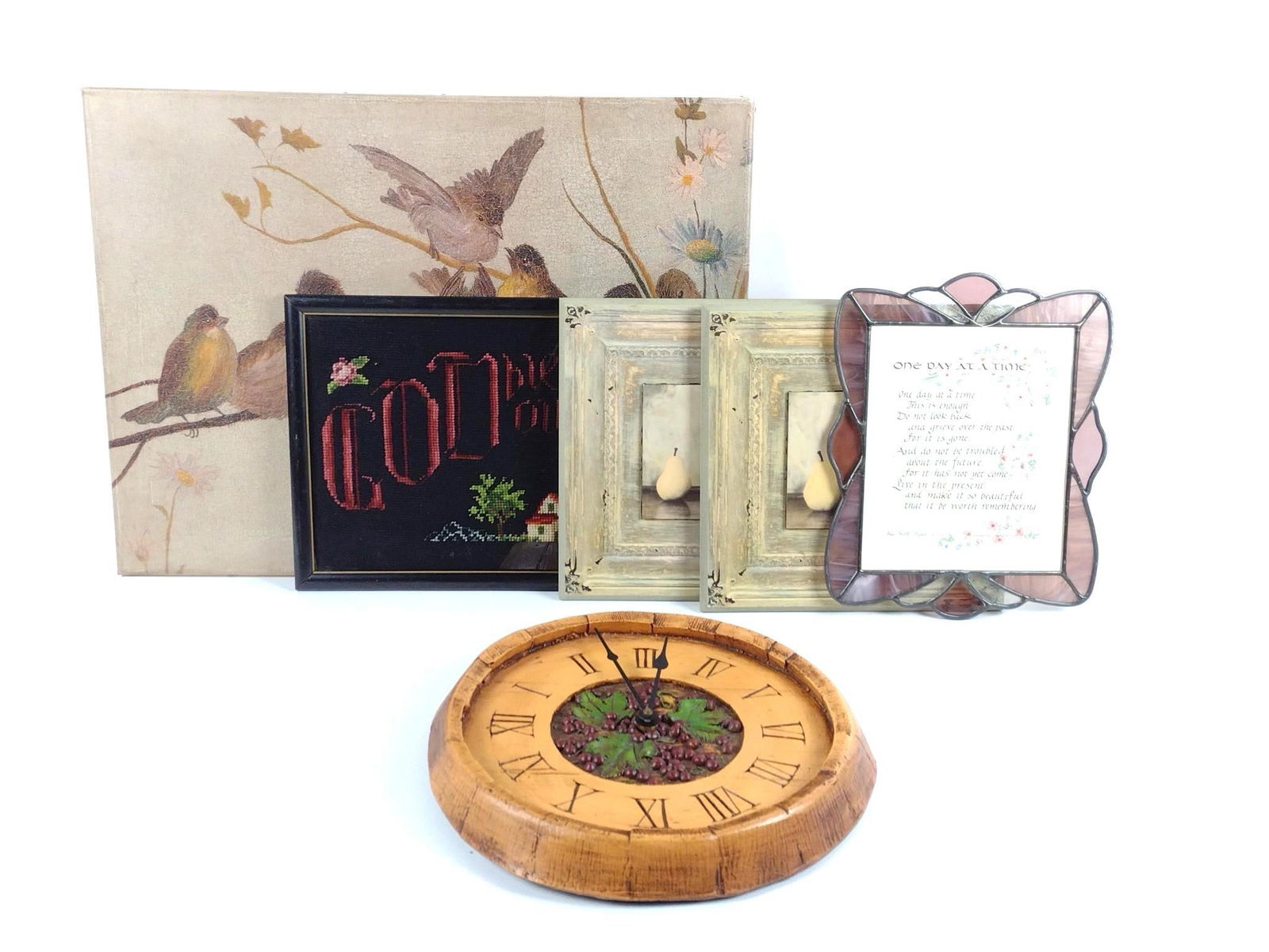 6 Pcs Wall Decor incl Clock, Needlepoint and Birds