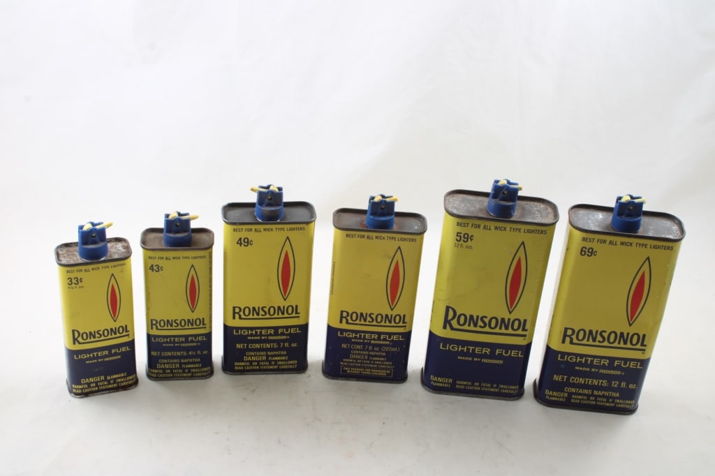 6 Ronsonol Lighter Fluid Empty Tin Cans