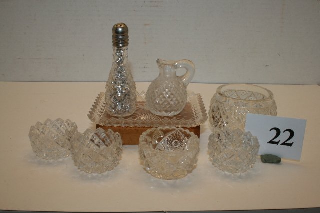 Lot of 6 Assorted Clear Glass Items19 hrs LeftVintage Lot Of Glass Bells And Serving Dishes4 days Left7PC LOT OF WATERFORD CRYSTAL, LISMORE PATTERNMar 07, 2026Lot Brilliant Cut Glass Items3 days LeftVTG Crystal Decanters, Glasses & Ashtray 8pc LOTFeb 26, 2026Lot of 5 EAPG Master SaltsFeb 22, 2026Lot of 4 Misc Pressed Glass Items6 days LeftLot of 4 Misc Pressed Glass ItemsJul 24, 2025Cut Glass Perfume Bottles and Vanity Decanter LotFeb 27, 20268 Items Lot, Crystal Pieces2 days LeftLot of 31 Assorted Glass Bottles & Serveware, Dairy, MedicinalFeb 21, 2026Lot of 4 Cut Glass Crystal DecantersFeb 21, 2026Lot of sterling silver dresser accessories, including various covered glass jars and scent bottles.Mar 01, 2026A composed lot of six various silver and glass tableware objectsFeb 24, 2026Lot of 6 Vintage Hand-Cut Crystal & Glass Salt & Pepper Shaker SetMar 01, 2026LOT OF SMOKE BELLS, OIL LAMP SHADES AND LABORATORY GLASSWARE 19th CenturyMar 04, 2026