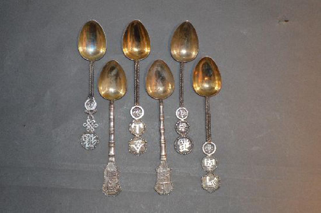 6 SIGNED CHINESE SILVER TEA SPOONS; 100.3GRAMS