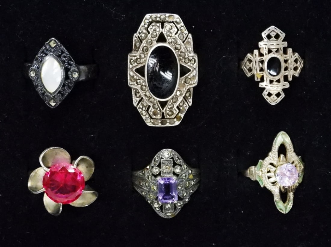 (6) STERLING RINGS, AMETHYST, ONYX, MOP
