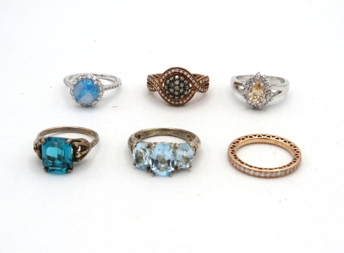 6 STERLING SILVER RINGS W/ GEMSTONES