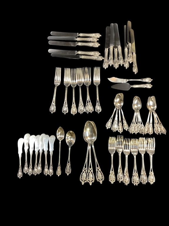 SoldSET OF (66) PIECE STERLING SILVER FLATWAREWeight - 64.895 troy oz. Condition - Two spoons with different design. One knife blade separates from handle. In-house shipping available within U.S. Packing cost- $20See Sold Price