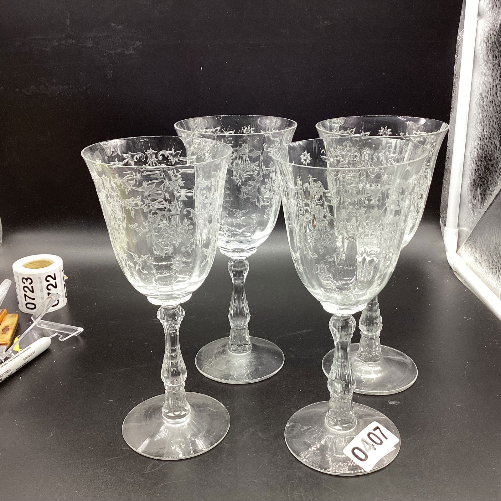 4 ETCHED CUT WATER GOBLETS