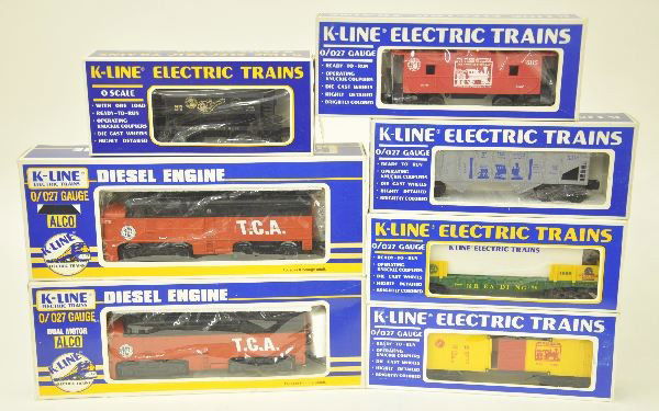 SoldK-Line TCA Diesel Freight SetIncludes a K-2222 TCA MP15 diesel; 6620 NETCA cannon car; 2 #6315 NETCA Bakers chocolate tank cars; K765-7426 Mass. Boxcar. All appear like new, cars boxes have been modified smaller, C9-10See Sold Price