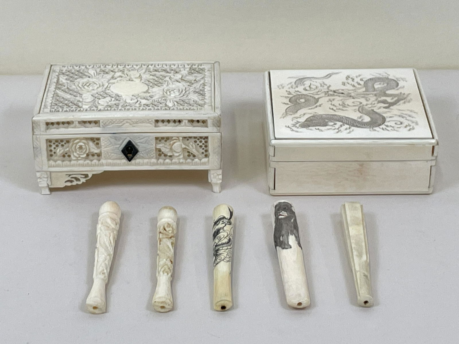 7 Pcs Bone Carved Boxes & Cigarette Holders