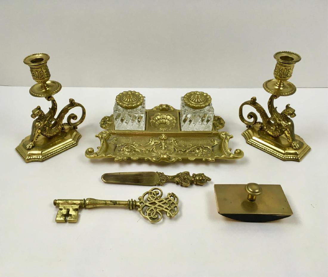 Lot of Assorted Brass, Antique Inkwells, 3 with Art Nouveau Motif, Double Branch Candelabra (13"h x5 days LeftBrass Desk/Table Articles (5), incl. Georgian CandlestickVa. Metalcrafters, Baldwin, Knob Creek Brass1 day LeftGroup of 5 Brass Candlesticks, with SnufferMar 21, 2026Group of Victorian Brass and Metal Desk Accessories Including Inkstand, Letter Opener, Book Clip and