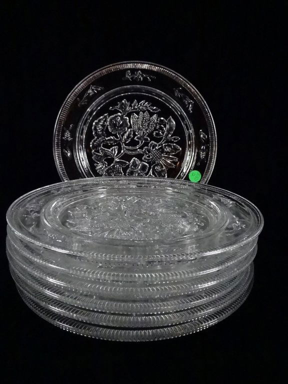 Sold11 PRESSED GLASS PLATES, DELICATE FLORAL DESIGN, APPROX11 PRESSED GLASS PLATES, DELICATE FLORAL DESIGN, APPROX 8.25" DIAMETERSee Sold Price