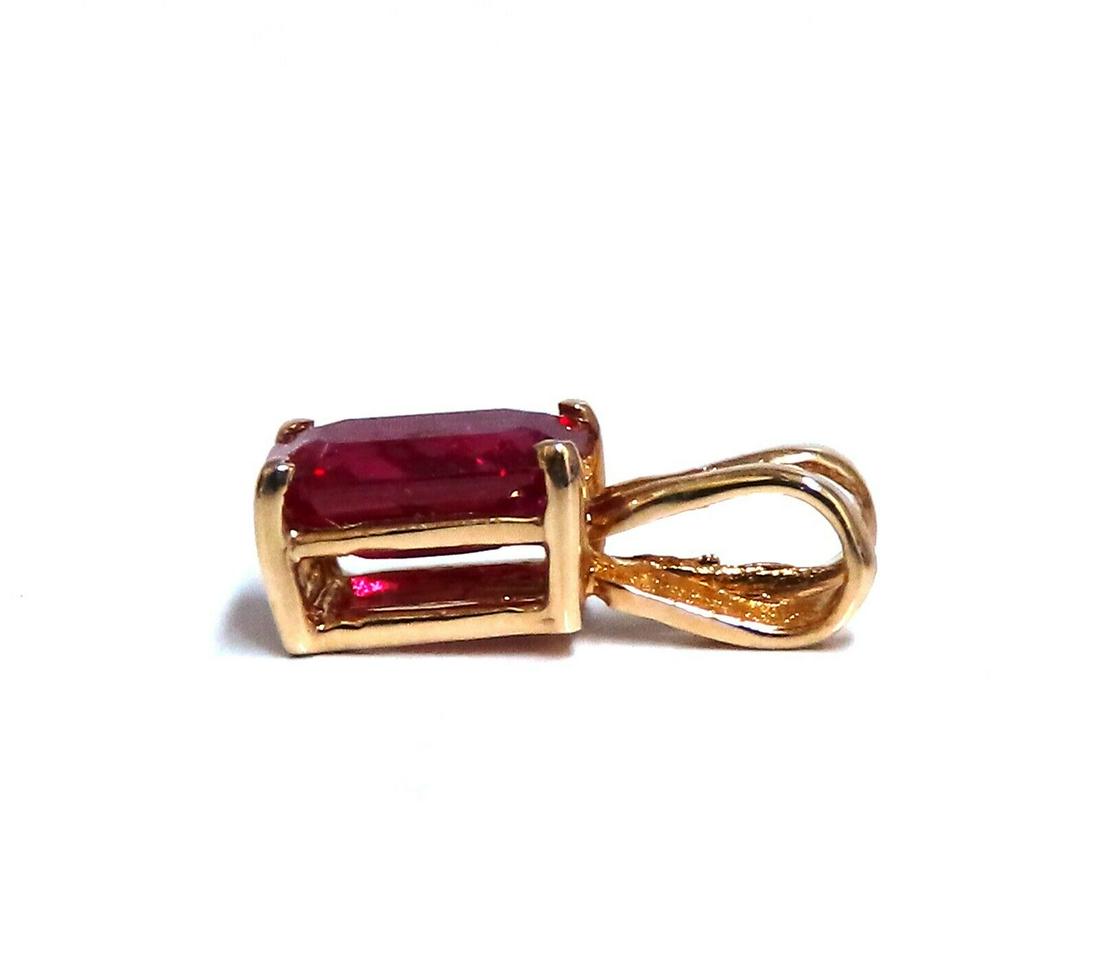 Sold.70ct Natural Ruby Pendant 14kt Vivid RedNatural Emerald Cut Ruby pendant Natural .70ct Rubies Brilliant Red, full cuts clean clarity & transparent Pendant 6 x 4mm total weight: .5 grams. 14kt yellow gold Track Page Views With Auctiva's FREESee Sold Price