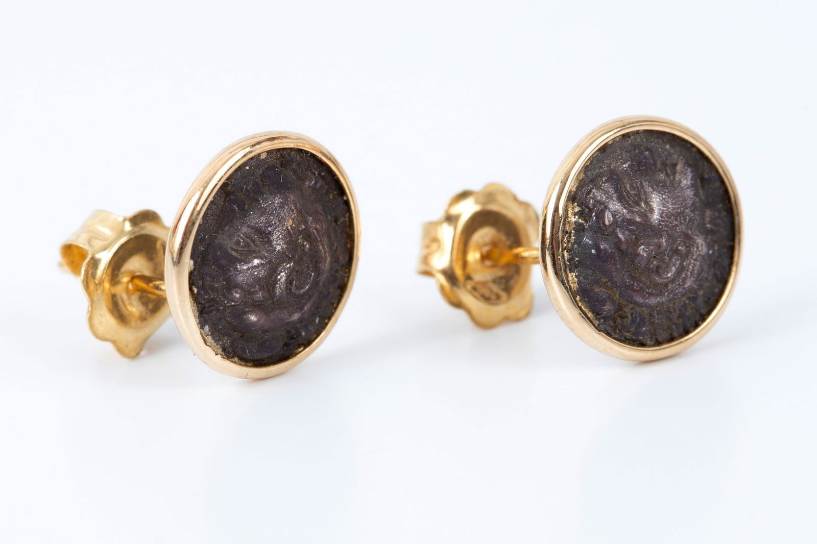 A Pair of 18K Yellow Gold and Greek Coin Earrings