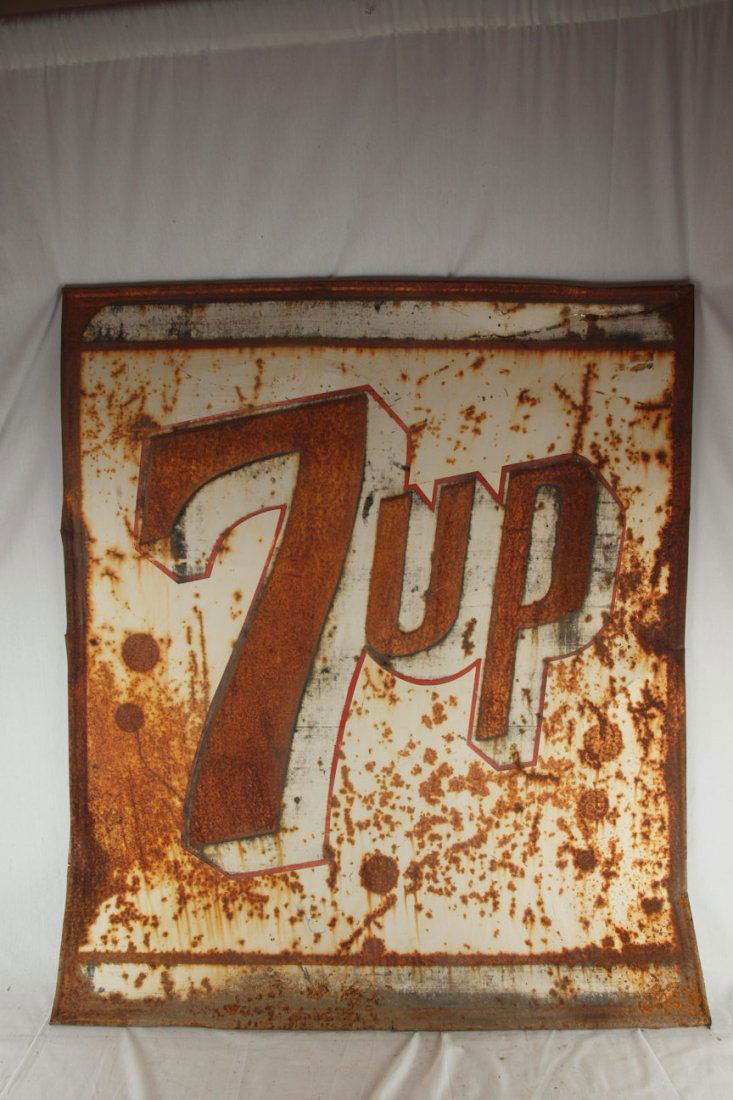 7UP embossed sign, rust, losses, 46" x 52"