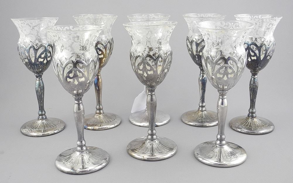 8 Glass Goblets in Silver Plated Stems, Solid 2886g, Loaded 1330g.