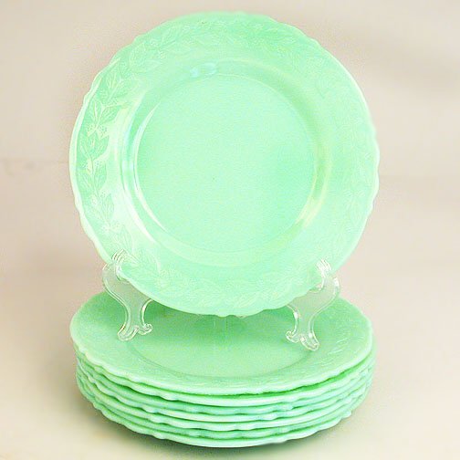 SoldEARLY 20TH C. JADITE VASELINE GLASS TEA SERVICE SETEARLY 20TH C. JADITE VASELINE GLASS TEA SERVICE SET Early 20th century jadite Vaseline glass tea service set. Unmarked. Includes: 6 saucers. Measure 5.25" by 5.25" 6 plates. Measure 8" by 8" ServingSee Sold Price