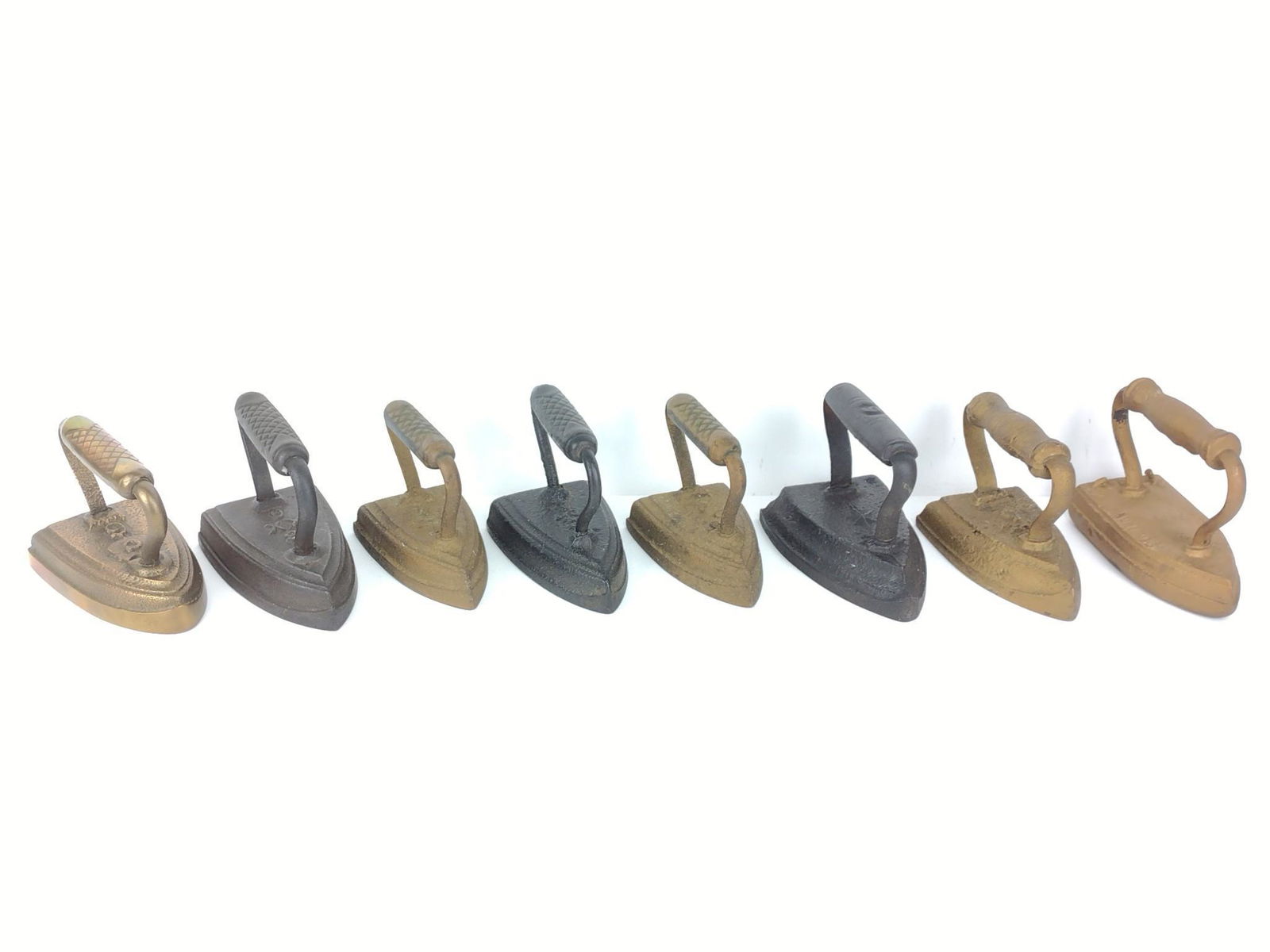 SoldSad Irons (14), a collection of various sizes from toySad Irons (14), a collection of various sizes from toy & salesman sample to full size, includes some w/removable handles, VG to Exc cond, largest 6"L.See Sold Price