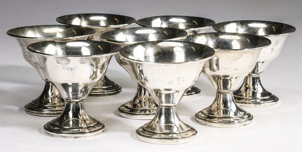 SoldAMERICAN STERLING SHERBET CUPS, EIGHTAMERICAN STERLING SHERBET CUPS, EIGHT, H 3":A set of 8 sterling silver sherbet pedestal cups; marked only "Sterling" (see photo). Measures H.3 1/4", Dia.3 1/2". Totaling approximately 21.6 troy oz. FoSee Sold Price