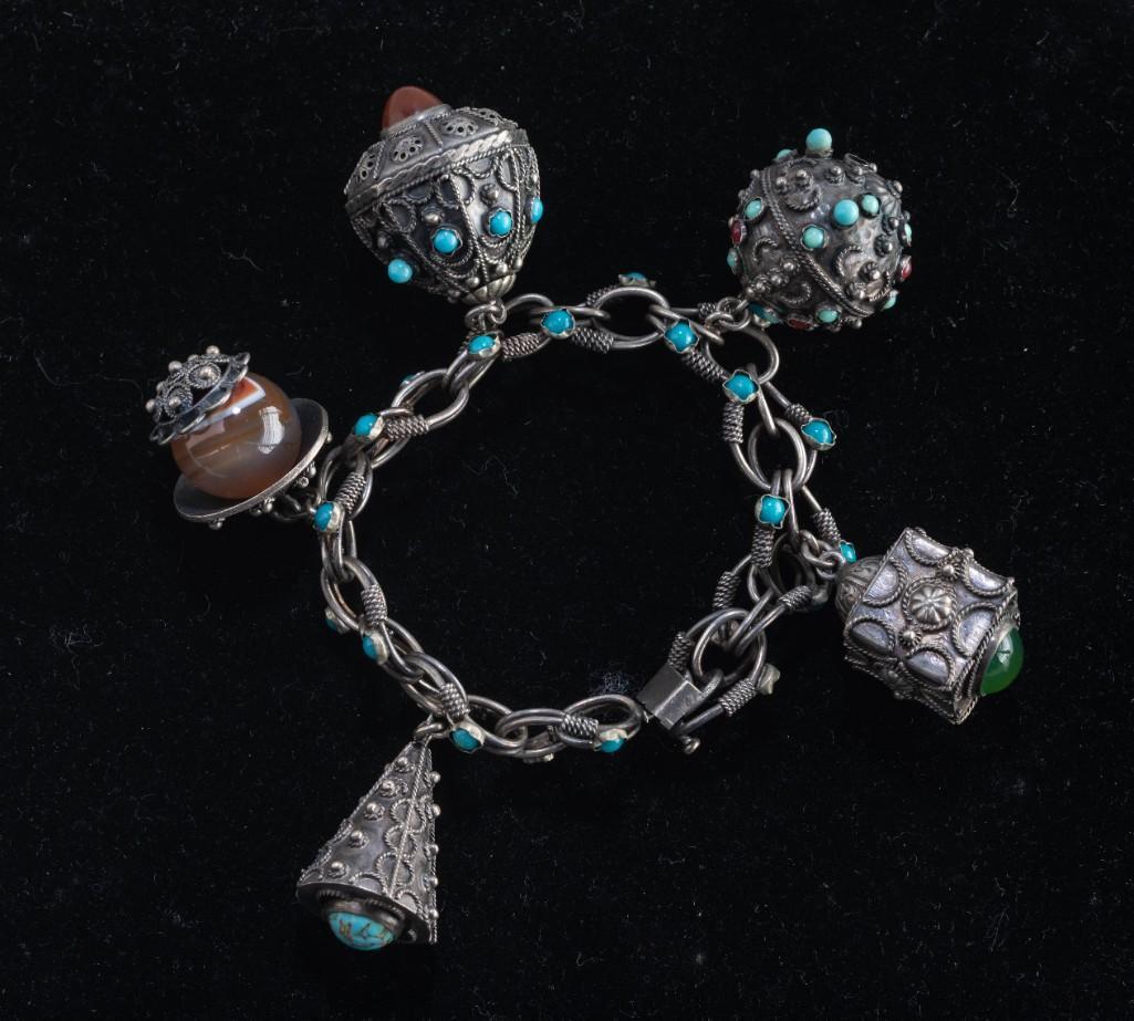 Natural and Faux Glass Stone Charm 800 Silver Etruscan Revival Style Puff Mariner Chain Bracelet H55This item is in good pre-owned, previously used/displayed condition with noticeable light wear, and surface scratches. Please reference all photos for full details. This piece of jewelry has been test