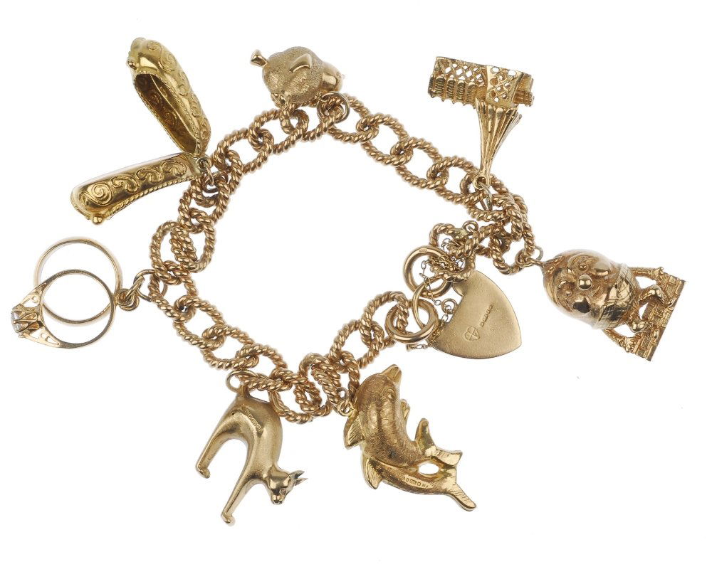 14K gold charm bracelet with 14 charms, including a 1907 US liberty head $5 gold coin (drilled),Tremont Auctions4.6(313)$850(3 bids)4 days Left