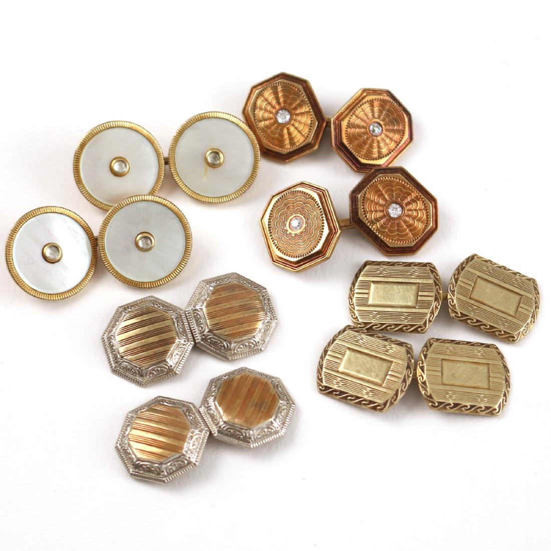 Pair of Gold, Sapphire and Diamond CufflinksMar 28, 202614K gold cufflinks with platinum fronts: pair of diamond and pair of sapphire, unmarked tested.6 days LeftOctagonal Antique 14k Gold and Platinum Engraved Grooved Cufflinks6 days LeftPair of Vintage 22k Gold 1883 Coin Cufflinks in 14k Yellow Gold Frames1 day LeftGF Cufflinks, Pencils and more3 days Left4 Gold Earrings / Cufflink3 days LeftArt Deco 14K Gold Cufflinks with 40 Sapphires 3.00 Ct5 days LeftFour Pairs Silver Cuff LinksMar 28, 2026Group of gem-set and gold cufflinks3 days Left10pc Timeless Vintage MISC Cufflinks Lot1 day LeftVintage Cuff Links, Silver Locket, India Spoon4 days LeftA silver dress set4 days Left16 Pcs Men's Cufflinks, Tie Clips, Tacks, & More5 hrs LeftA 14k gold and gold-filled dress set4 days Left5 Pairs Gold-Toned Costume Earrings5 hrs LeftGold Tone Cufflink and Button SetApr 08, 2026