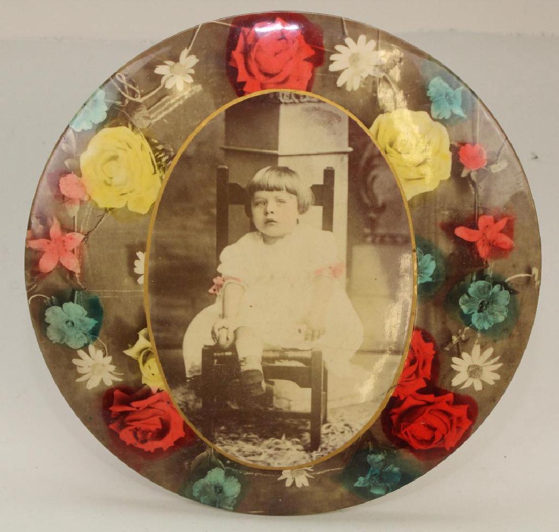 Sold9" ANTIQUE PHOTO BUTTON WITH EASEL BACk.Sepia photo of small child sitting on chair. Photo is surrounded by flowers that have been colored to frame the child.See Sold Price