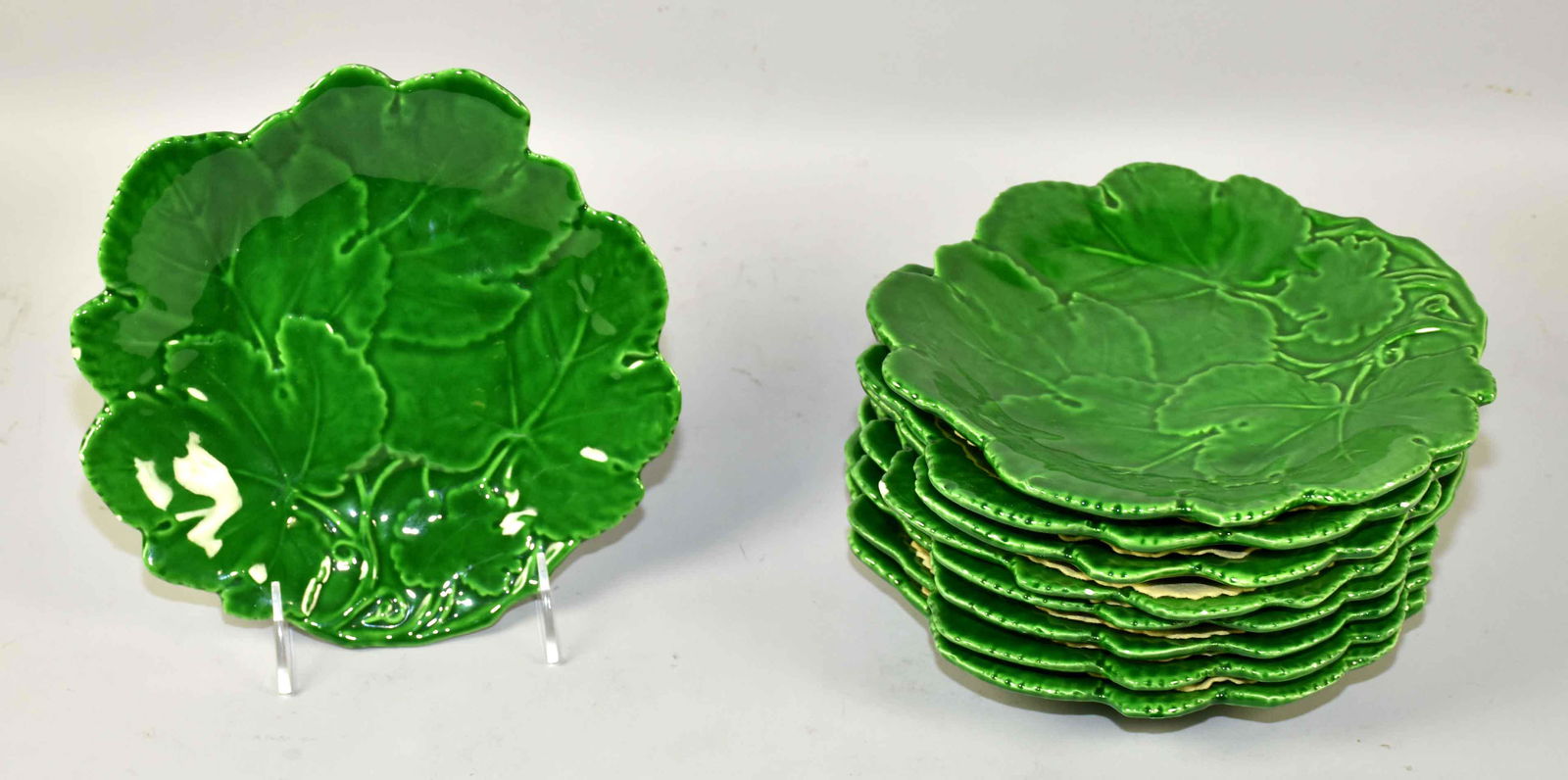 (9) MAJOLICA LEAF PLATES. 8'' diameter. Condition: some