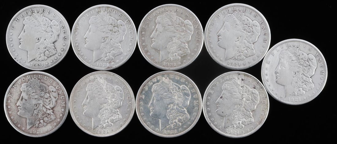 SoldLOT OF 9 1921-S MORGAN SILVER DOLLAR COIN ESTATE FINDA COLLECTIBLE LOT OF 9 1921-S MORGAN SILVER DOLLARS THAT APPEAR TO BE IN VERY GOOD TO FAIR CONDITION. WE ARE NOT COIN EXPERTS SO WE WILL LET YOU BE THE JUDGE OF THE CONDITION. BUYING AS IS. SHIPPING ASee Sold Price