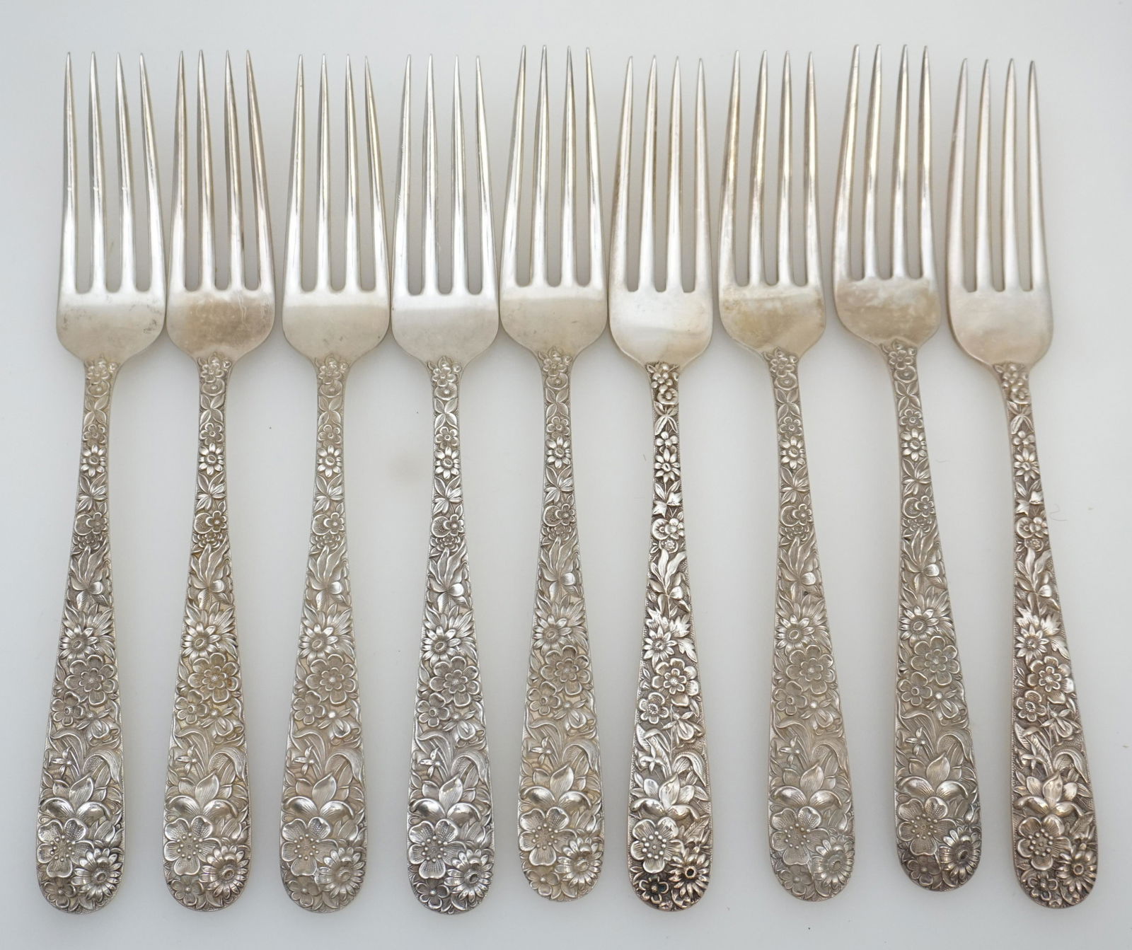 9 STERLING STIEFF REPOUSSE DINNER FORKS