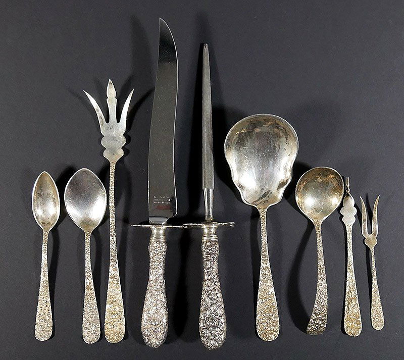 9 STIEFF ROSE Repousse Sterling Silver Serving Pcs