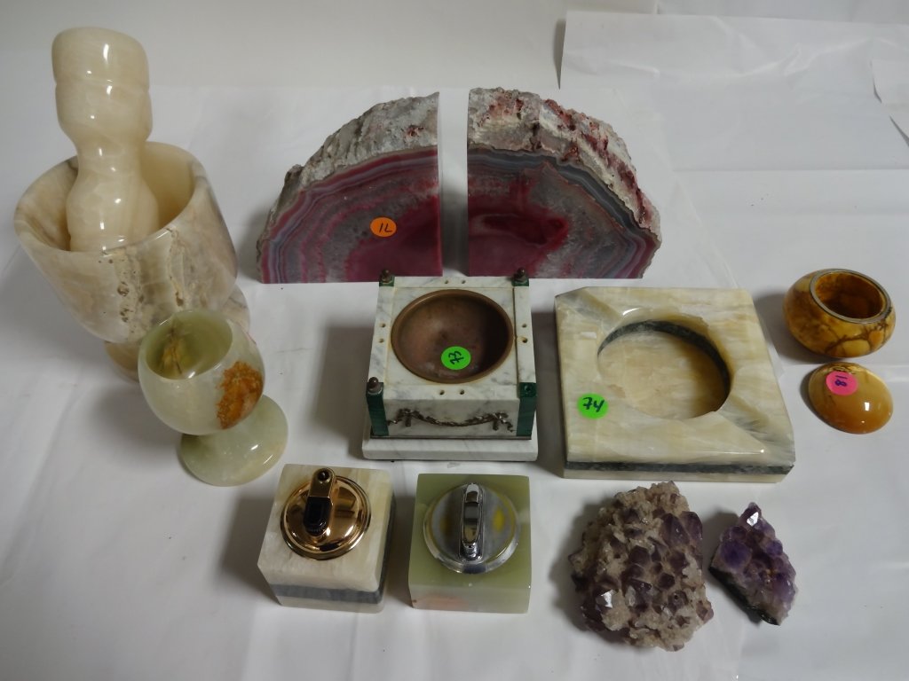 9 Vintage Hardstone Items- Bookends,Lighters,+++