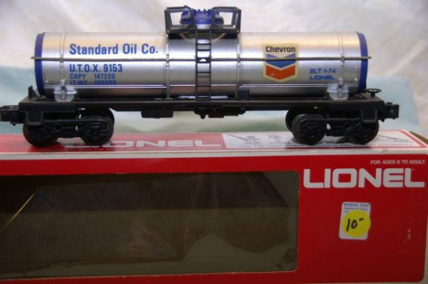 SoldLionel 9153 Chevron Single Dome Tank CarLionel 9153 Chevron Single Dome Tank Car. This is approximately 10 3/8" x 2 3/4" x 3 1/8" and it weighs 0.98lb. There is some wear on the Chevron decal, markings, and scratches. There is also a rattliSee Sold Price