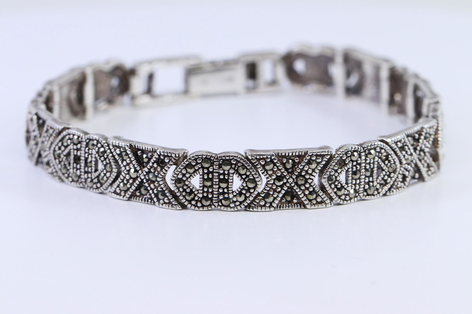 Sold925 Silver Ladies Bracelet with Blue Zircons and MarcasiteTitle: 925 Silver Ladies Bracelet with Blue Zircons and Marcasite Description: 925 Silver Ladies Bracelet with Blue Zircons and Marcasite -Condition:New Weight:26.1g -Size:7.87 in (20cm) Link Width:0.See Sold Price